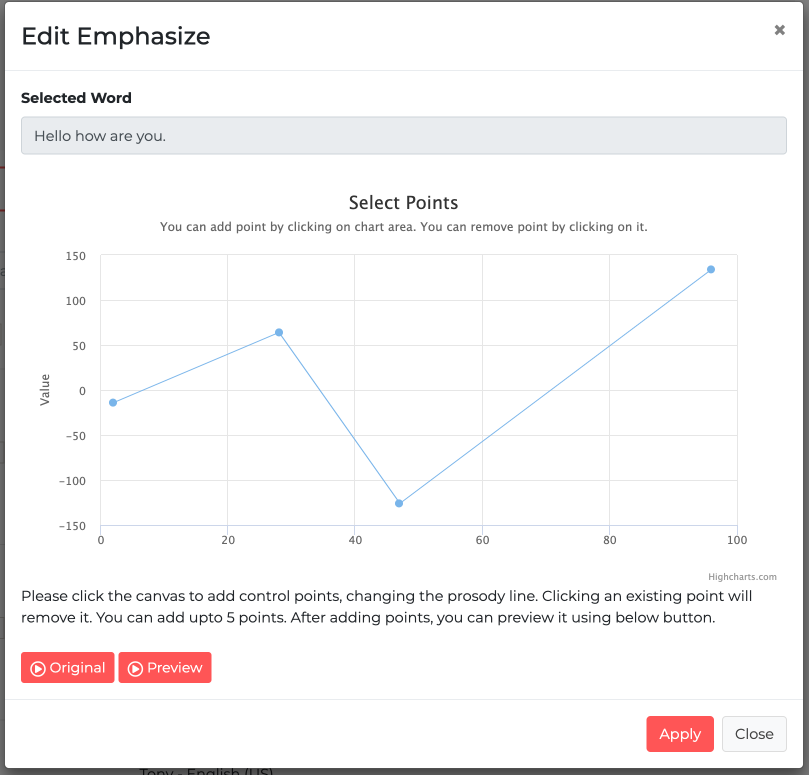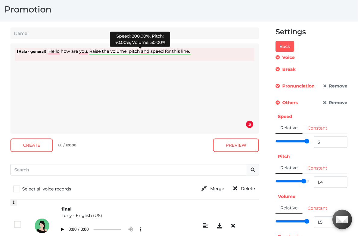 Voices from the English (USA) and Chinese (Mandarin) have a variety of voice styles. Choose the voice Style & do other customization such as phoneme for words, custom pronunciation etc.
